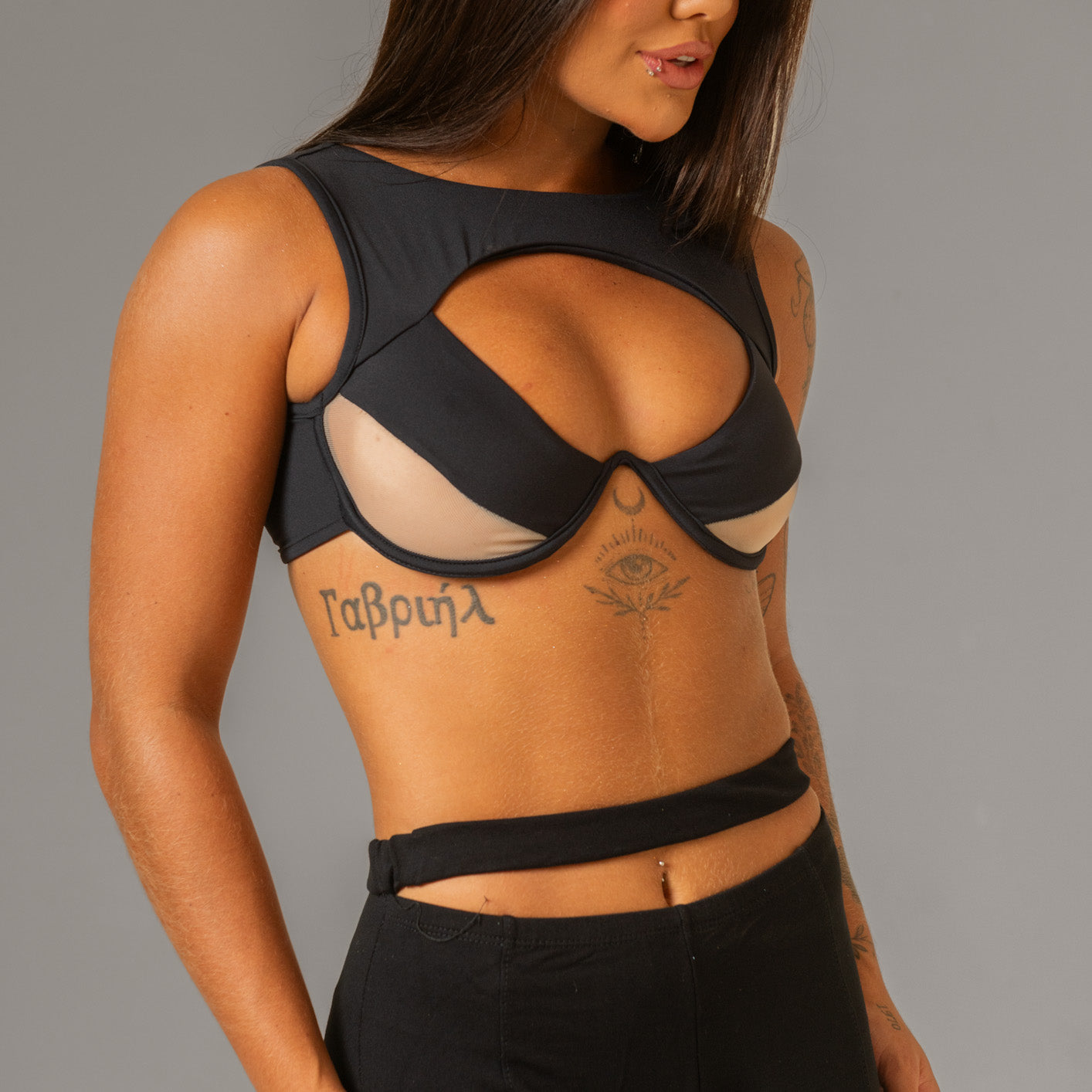 Com recortes estratégicos e tela transparente, o top tori destaca o colo de forma ousada, sem perder o conforto. O aro valoriza o busto e garante firmeza, enquanto o design recortado com sobreposição traz aquela pegada fashionista que você ama!